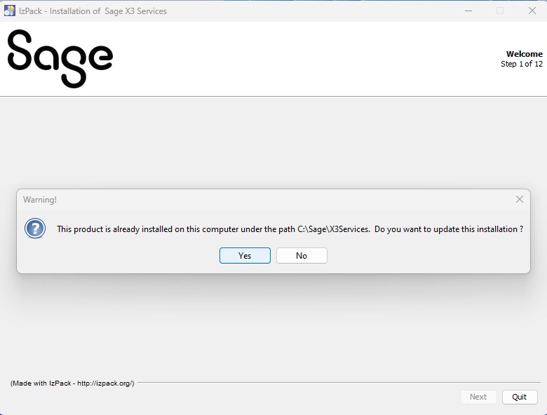 If you've already installed Sage X3 Services in your computer, the installer asks if you want to update your Sage X3 Services installation.