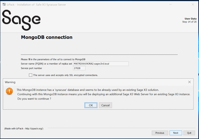 - After the Syracuse web server installer connects to MongoDB using the defined MongoDB service port, the installer checks whether a "syracuse" database exists. Since release 2025 R2/V12.0.38, a new automatic mechanism has been put in place during the Syracuse web server installation in order to detect if a license exists yet for a given Sage X3 solution. This solution was especially required for a Sage X3 solution with Multi-Syracuse architectures. The mechanism of checking for a "syracuse" database in MongoDB is enhanced by checking for a valid license in the "license" collection. If a valid entry is detected, the following pop-up is displayed: