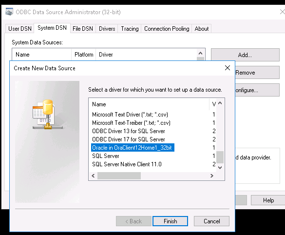 Launch ODBC data Source Administrator 32bit (windows\sysWOW64\odbcad32.exe). Then create a new system datasource with the Oracle in Oraclient12Home_32bit driver.