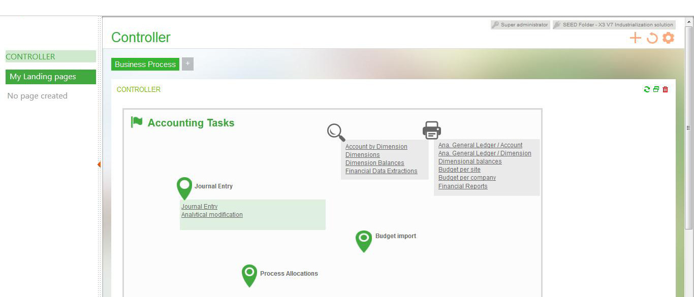 A home page, also called landing page, organizes different frames wherein figures and/or processes appear to give you a first view of your activities. They are called "vignette", but they refer to menu items. This function describes the setup of these pages.