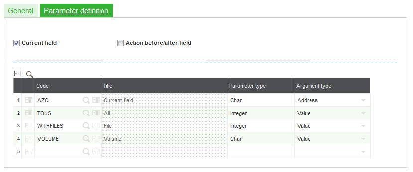 | ALL | All volumes | Local menu 1 choice | If set to Yes, all the available volumes are displayed. If set to No, the default volume is displayed (set in "VOLUME"). |