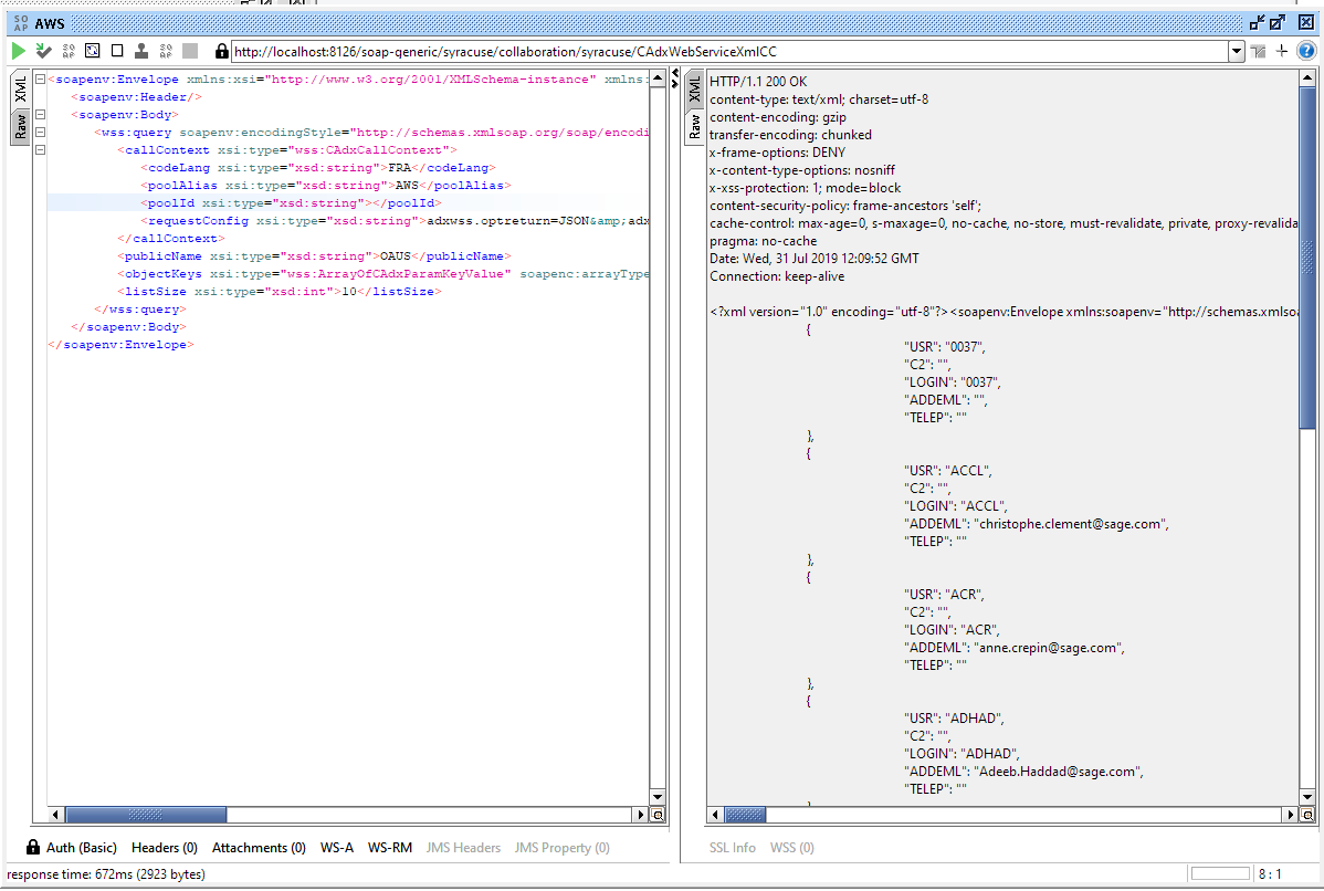 codeLang FRA: language in which the answer is expectedpoolAlias AWS: Pool to use defined in Syracuse in the following section: Administration > Web Services > List of soapClassicPoolspublicName=OAUS: Web Service to calllistSize 10: maximum number of received results