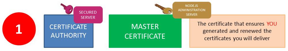 In this diagram, you can see that only one master certificate exists, and that the corresponding private key is kept safe on a master secured server while the certificate is distributed on each node.js server.