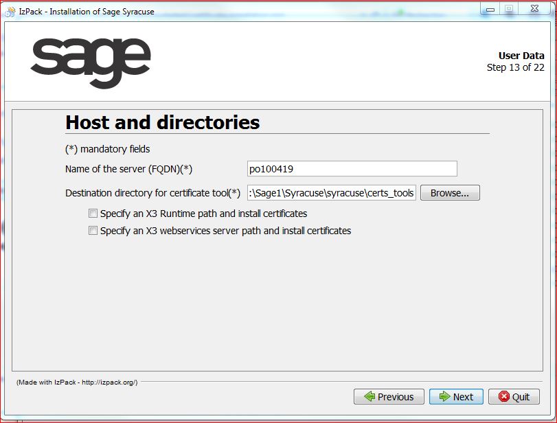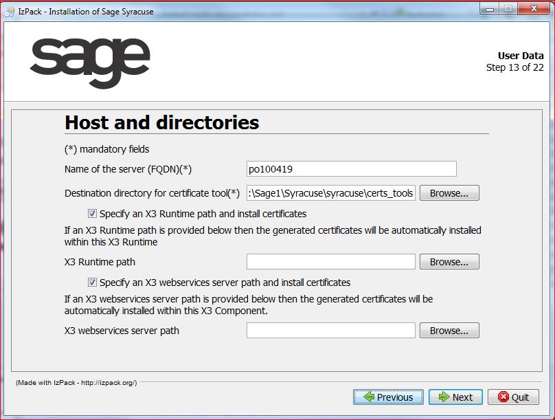 - Select Specify a Sage X3 Runtime path and install certificates if a single physical server hosts the node.js server and the Sage X3 runtime, or Specify a Sage X3 webservices server path and install certificates if applicable.