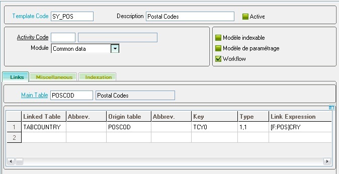 Some index might have to be added if there is no easy link. For example, between functions profiles and access codes, a new index on 'ACCES' table is necessary. It is also necessary to create an index if the variable field of a (0,N) link is not in the last position. For example, to have a link for company between 'BPADDRESS' and 'BID', an additional index 'BID2' referencing 'BIDNUM' in the last position has to be created.