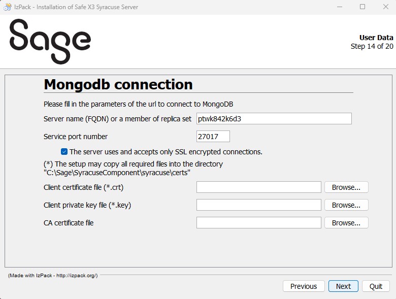 Note: The Client certificate file and the Client private key file should only be entered if you manually installed the certificates.Refer to Certificate Installation for the rest of the installation procedure.