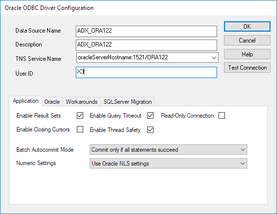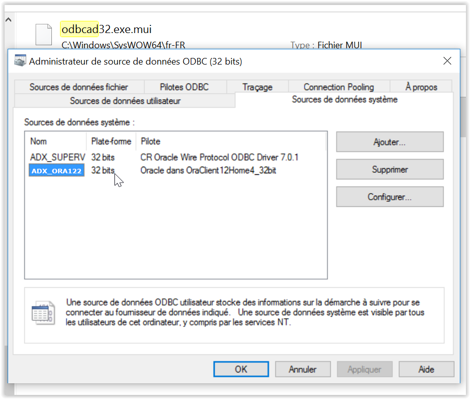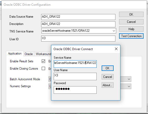 In the example below, we can see the entry Name of the ODBC source: ADX_ORA122.