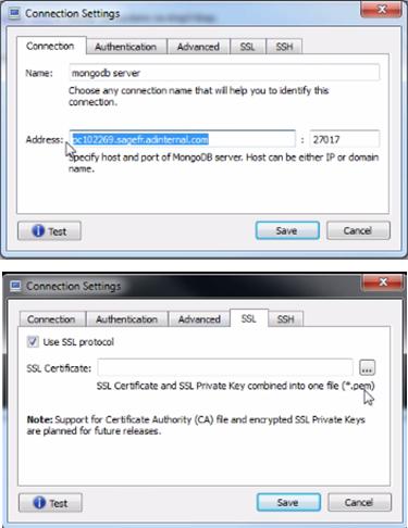 confsub-directory of the installation directory), a set of files related to certificates. The only file that you have to copy on the server that runs 'robomongo' is calledclient.pem. This file can be renamed. - When launching 'robomongo', the configuration setup has to be defined as shown in the screen: