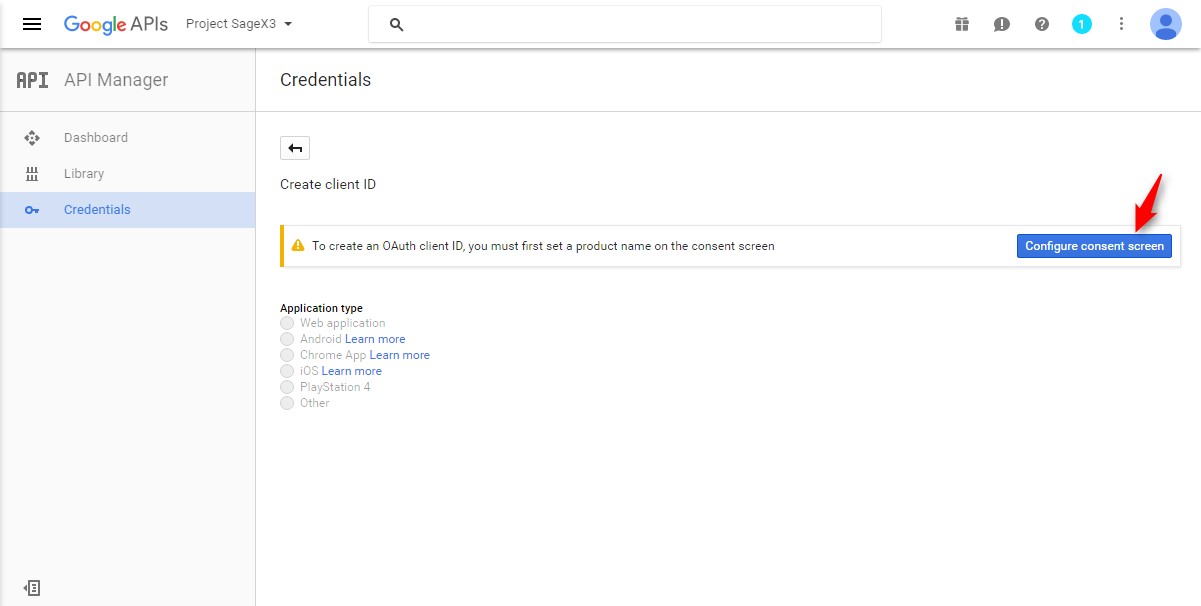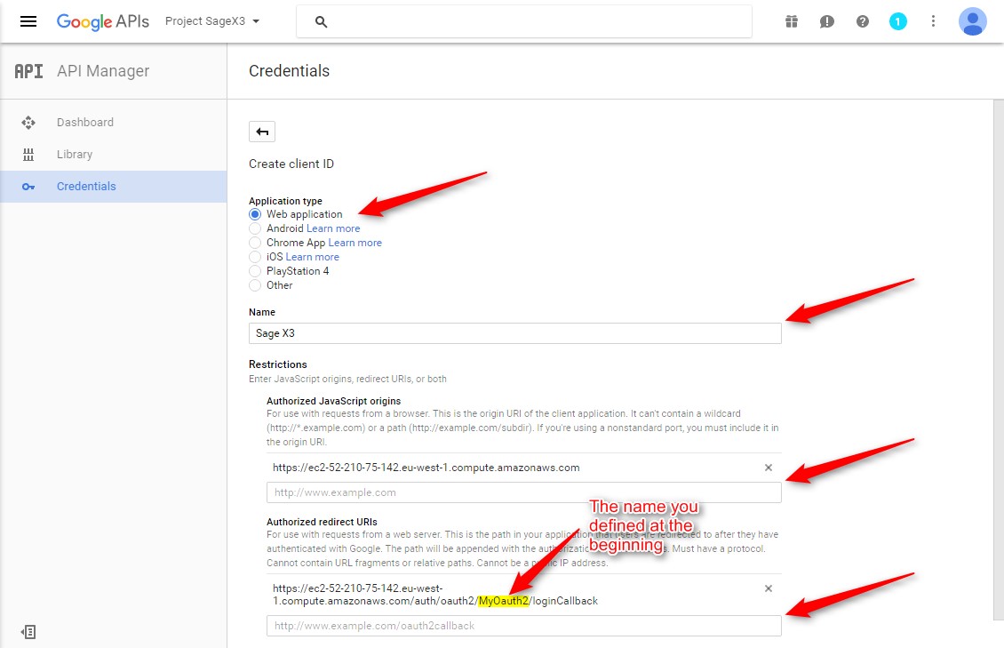 8. Select Web Application, and enter the Name, Authorized JavaScript origins and Authorized redirect URLs.