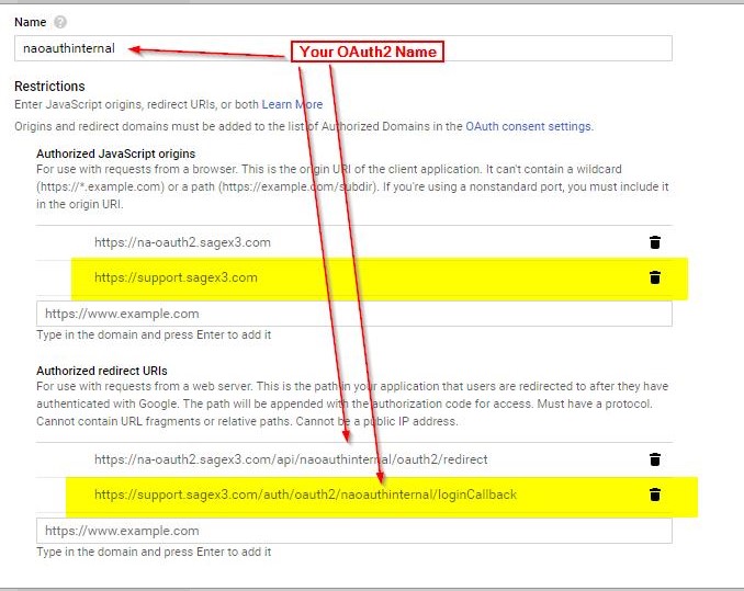 So the values for Authorized JavaScript origins and Authorized redirect URLs are https://support.sagex3.com and https://support.sagex3.com/auth/oauth2/naoauthinternal/loginCallback.