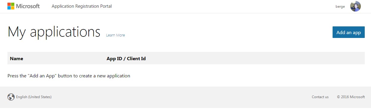 1. Go to https://apps.dev.microsoft.com and click Add an app.