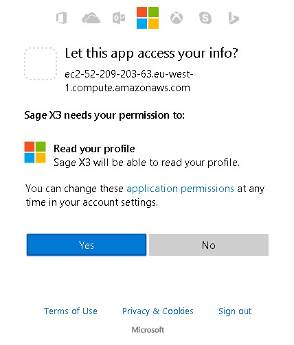 3. When prompted to, allow Sage X3 to access your Microsoft profile when logging in for the first time.