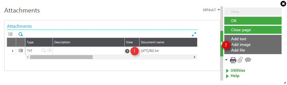 In this window, we can find the list of attachments in a grid, with the associated keywords. Click the chevron (1) to display the corresponding file. The file may be a text or an image file stored in the database. Otherwise, the file is downloaded and the file viewer program, if known, is opened to display the file content and possibly to edit it.