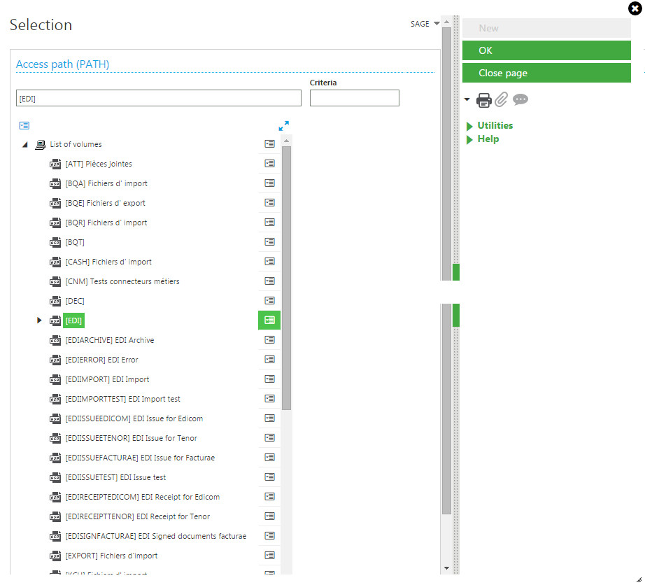 Add file will open the following window to select a file in one of the volumes available (in this case, only the path is stored in the attachment table). As this action can display a huge number of files (see below), the download of the file list is done volume by volume and directory per directory. It can be filtered by the value entered on the criterion field. For instance, typing doc in the criterion field will display only the files containing the "doc" substring, eg. myfile.docx, document1.xls... The wildcards (*,?) can be entered in the criterion; for instance my?*.docx to return only the files with docx extension starting by "my" followed by at least one character. |