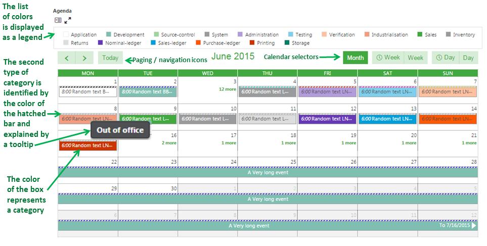 The calendar widget displays all the elements as boxes in a calendar as follows:
