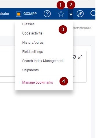 Bookmarks are available as a dropdown list using the down arrow (2) next to the star icon in the global header: