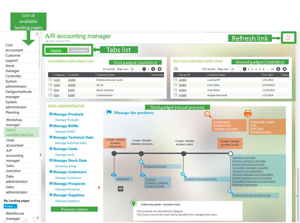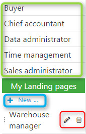 A user with a given role has access to different landing pages. The last landing page displayed is considered to be displayed for the next connection time. The user can, at any time, select another landing page if the user is entitled to. The authorized landing pages are available on the left landing pages selector: