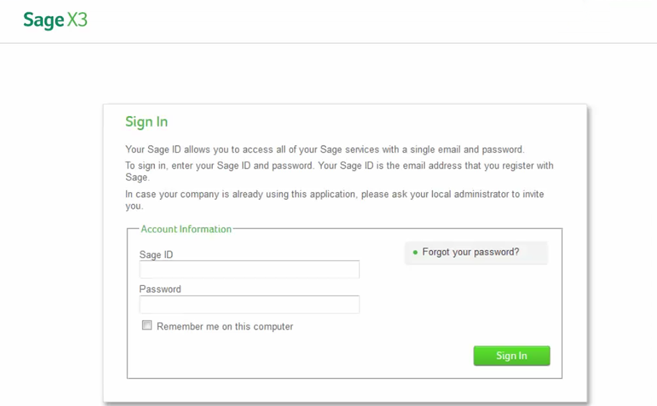 You need a Sage ID to log in to Sage X3. However, there are two methods to log in to Sage X3, with two different initial pages. Use method 2 if you don't already have a Sage ID, or if your account is not registered.