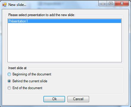 - If Microsoft PowerPoint is already opened, the following window appears, and displays the different presentations opened. You can then choose the right presentation where you want to insert your presentation page, and the position (after the current page, at the beginning, or at the end of the presentation):