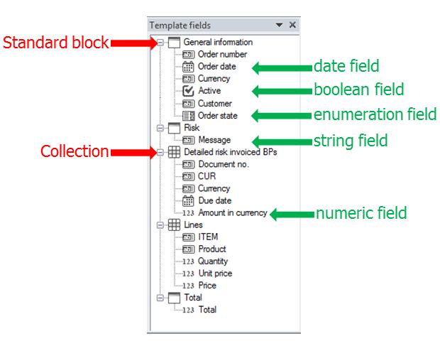 Select the show fields check box to display a list of fields you can add to the new template. Standard blocks, collections, and field types are denoted by different icons. Double-click fields from the list to add them your template.