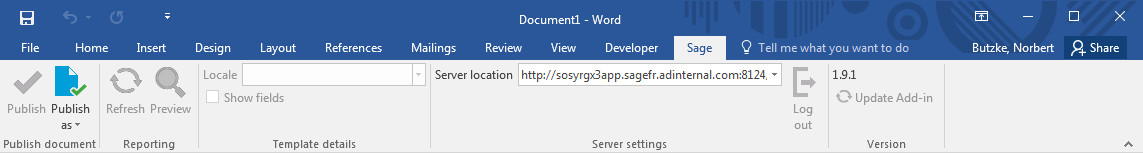 When you have finished selecting fields, save the file as a template by clicking Publish as (if you have not saved your template) or Publish in the Sage X3 toolbar in Word: