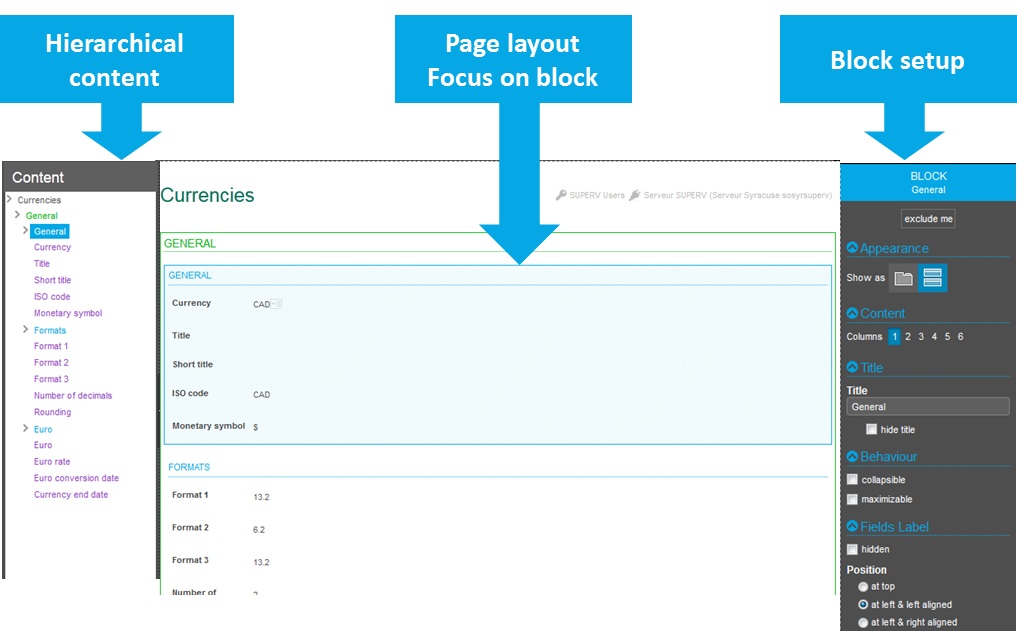 When clicking the frame of a block (displayed in blue), or if a block definition line of the organization panel is selected, the page displays the following: