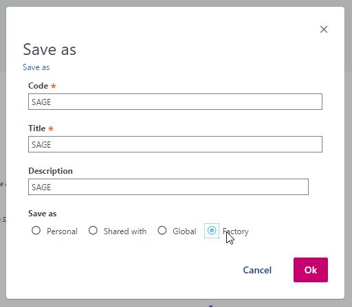 A default personalization, known as factory personalization (and named SAGE), is delivered for all the standard pages available in Sage X3. Additional factory personlizations can be delivered by Business Partners named according to the factory owner (see User management).