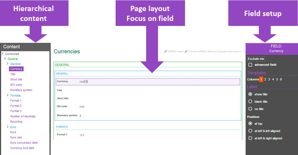 When clicking the frame of a field (displayed in purple), or if a line corresponding to a field is selected, the page displays the following: