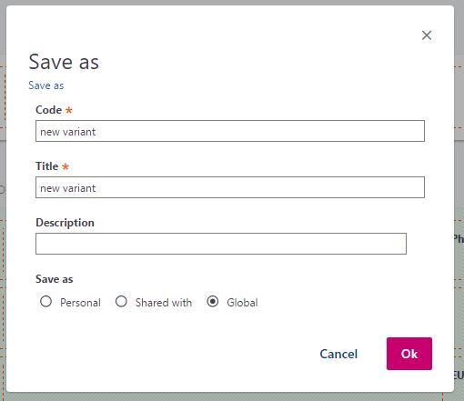 If a displayed page has at least a variant that is not the factory variant, the name of the variant that is used is displayed on the right of the page, just under the top bar, and prefixed by view: