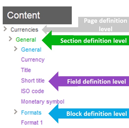 This panel lists the complete structure of the page. A page is organized in four levels: