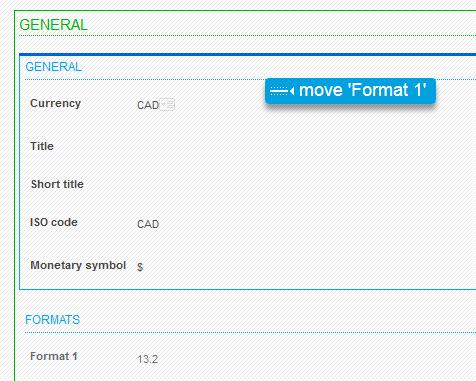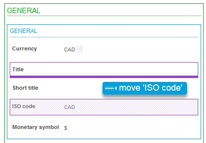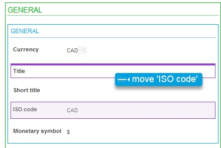 Moving elements can be done by performing the drag-and-drop method in the central personalization area. Any element (field, block, or section) can be moved by dragging and dropping in the desired location. A small indicator shows the destination location of the element being moved.
