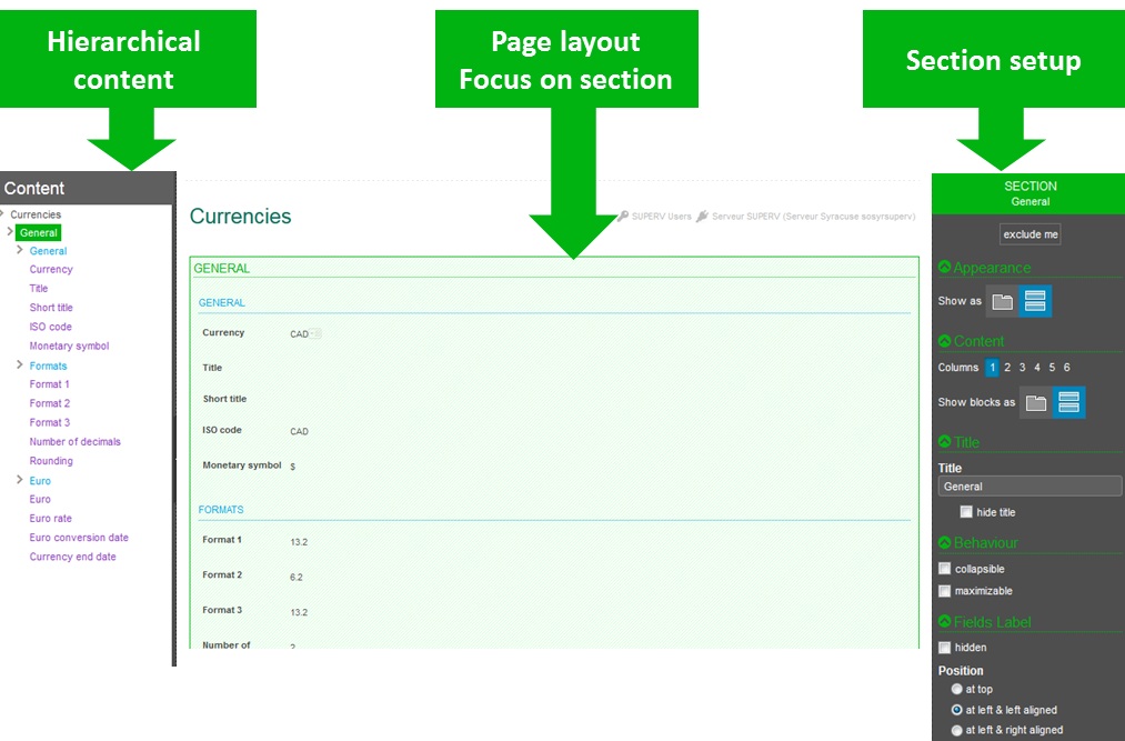 When clicking the frame of a section (displayed in green), or if a section definition line of the organization panel is selected, the page displays as follows: