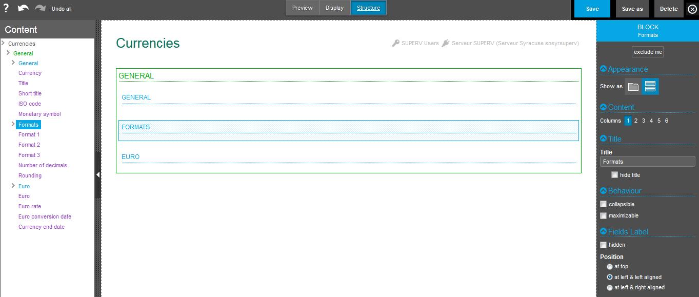 The same rules for field labels display can be set up, but only for the fields in the current block: label hidden, blank or visible, and label position at top or at left with left or right alignment.
