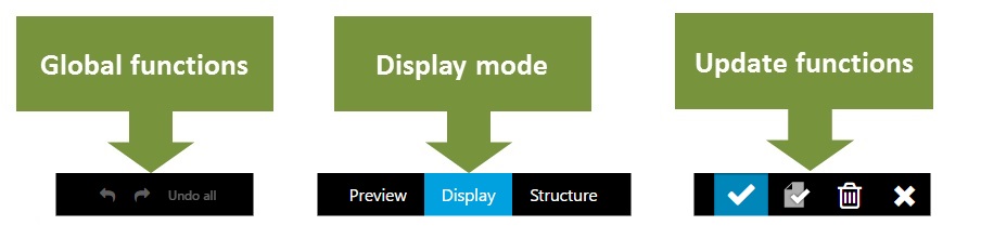 - The first group gives access to global functions: undo / redo for modifications, and access to help.