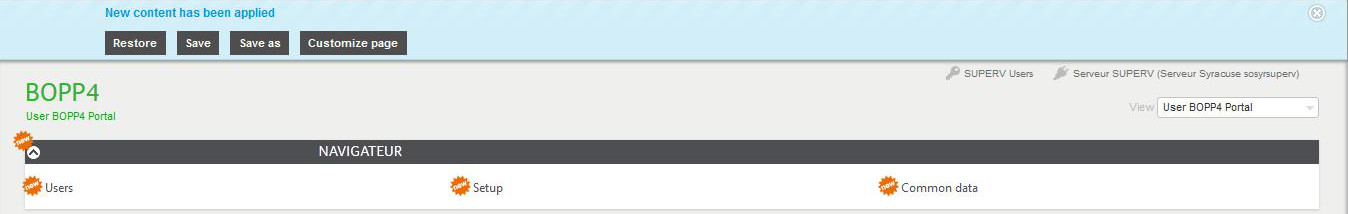 | Replace | Replaces the existing personalization by the new portal page and displays the expected result in a page that looks like the following screen:![]() In this page, the new elements are prefixed with a "new" label in an orange star (the new widget and the new entries are prefixed). The user has the ability to perform the following actions: