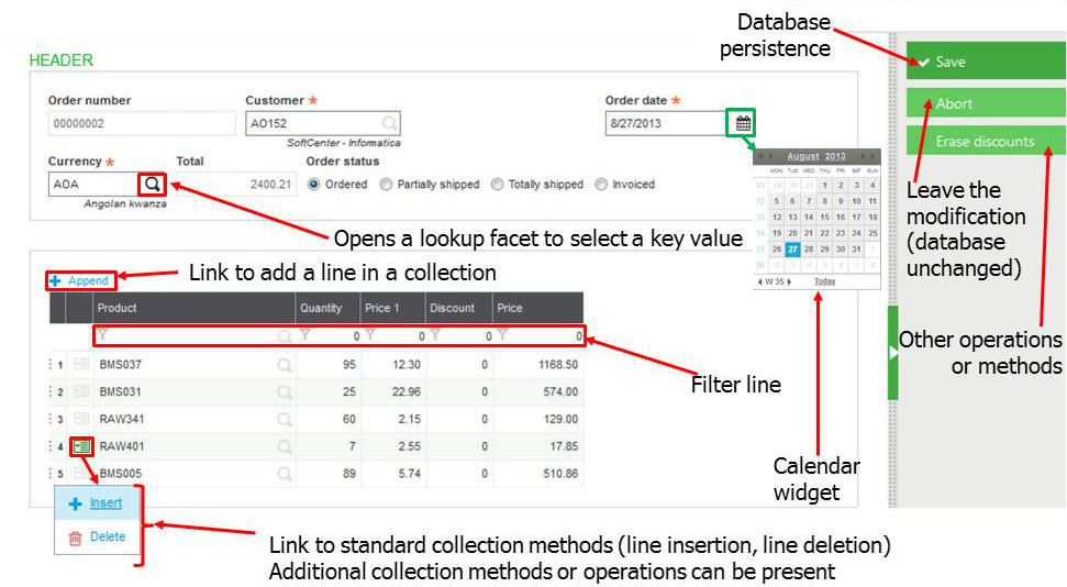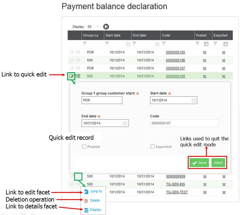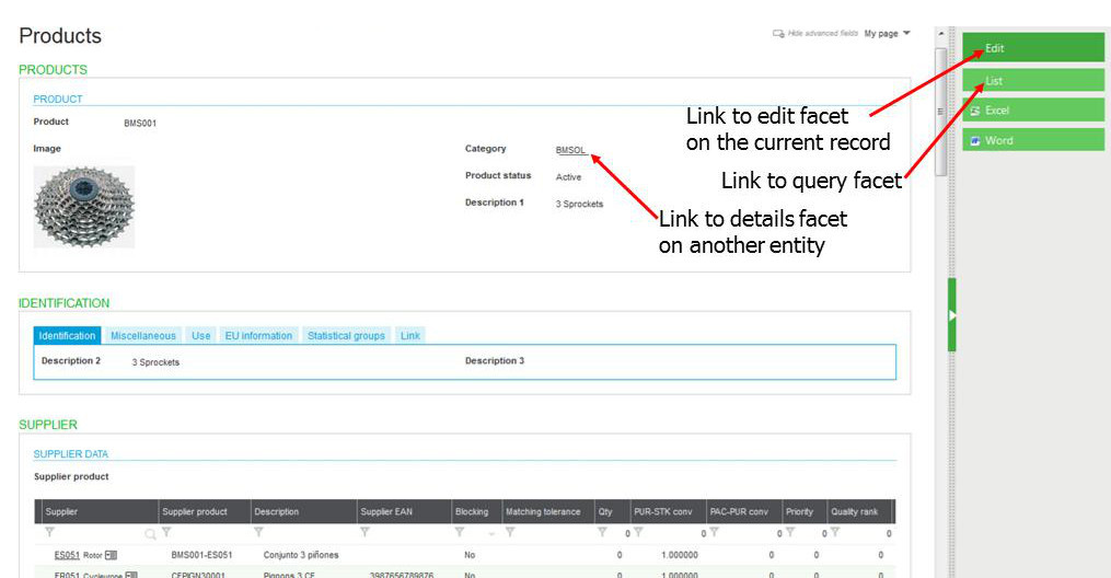 - The edit facet is used to create a new instance of an entity or to update an existing instance. A quick edit can also be displayed directly from the query facet to edit the current line.