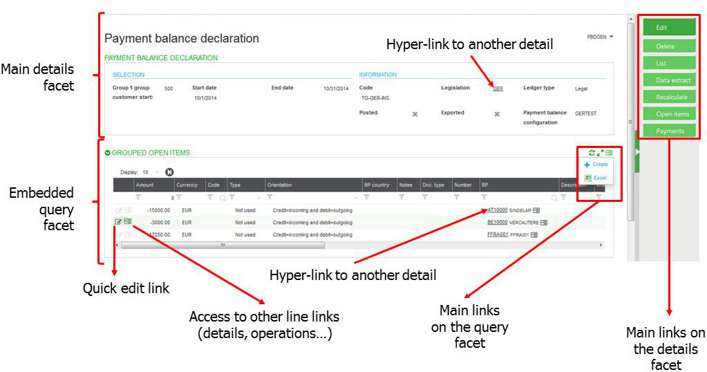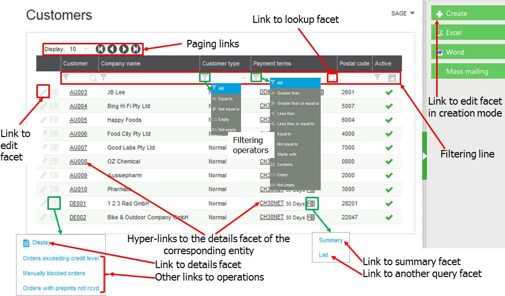 * A detail link on every record. Usually, this link is displayed as a standard hyperlink: the entity key is underlined and opens the detail facet.