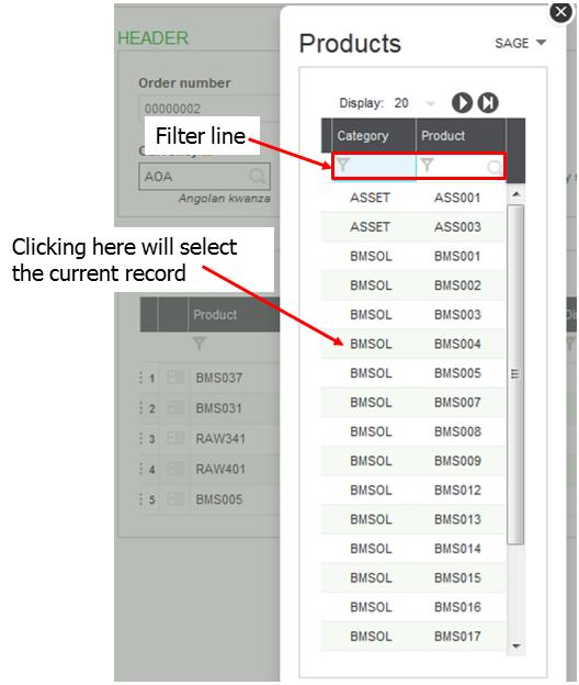 It is launched from a field that is a reference on another entity. Filtering and paging can be done. Clicking on a line performs a selection and returns the current value.