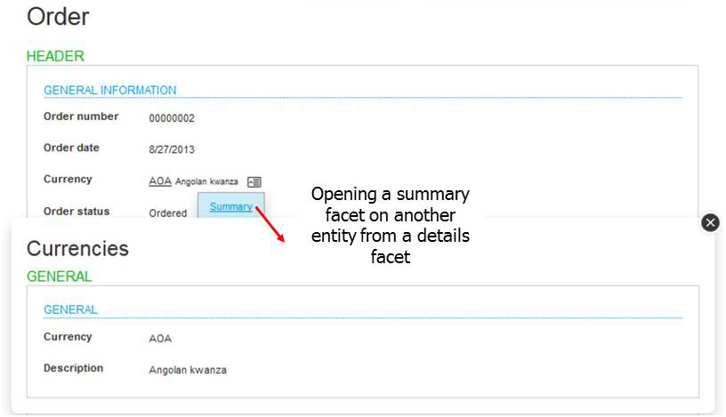 - The summary facet is used to display a summarized view of the instance of an entity.