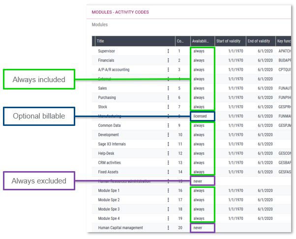 The license determines if a module activity code is available. However you can choose if you need one or not folder by folder.